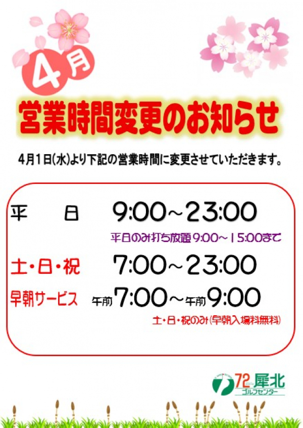 4月営業時間変更のお知らせ